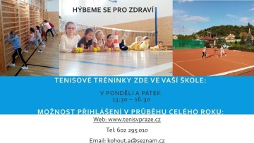 Trénujeme předškoláky i školáky přímo ve škole v Čisovicích. Vaše děti zábavnou formou naučíme základy tenisu + jak správně cvičit, posilovat, protahovat, běhat atd.., časem mít opravdu z této hry radost a zdravotní prospěch.